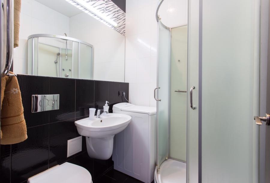 Современный санузел, импортная сантехника, душевая кабина с гидромассажем, стиральная машина, газовая колонка автомат.