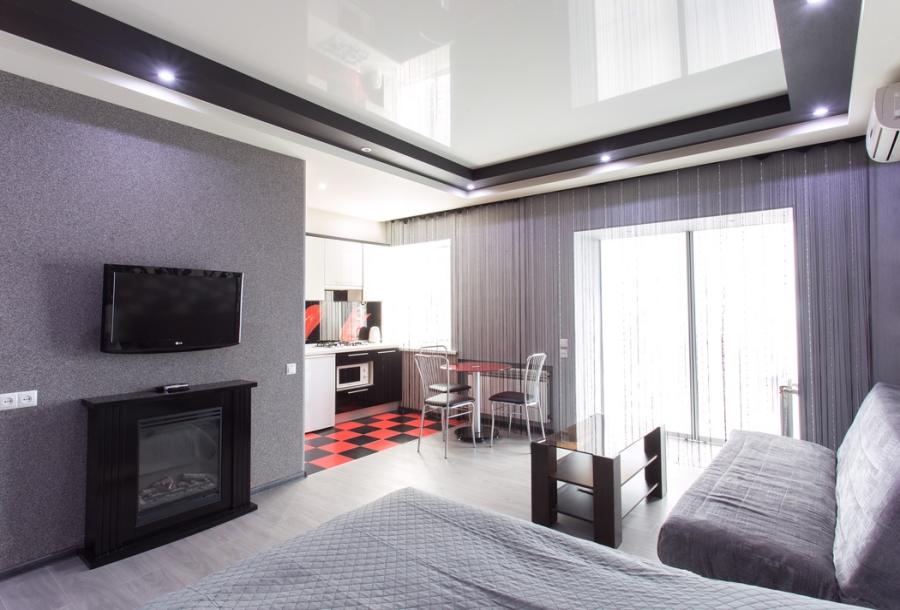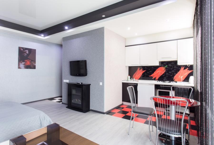 Оригинальный дизайн интерьера в стиле Модерн выполнен в черно-белых тонах с красными акцентами в мебели. Высокие двухуровневые потолки, французские натяжные потолки с разнообразным точечным освещением. Большая студия с двуспальной кроватью, диваном для отдыха, шкафом-купе с зеркалами. Камин придает квартире дополнительный шарм и уют.
